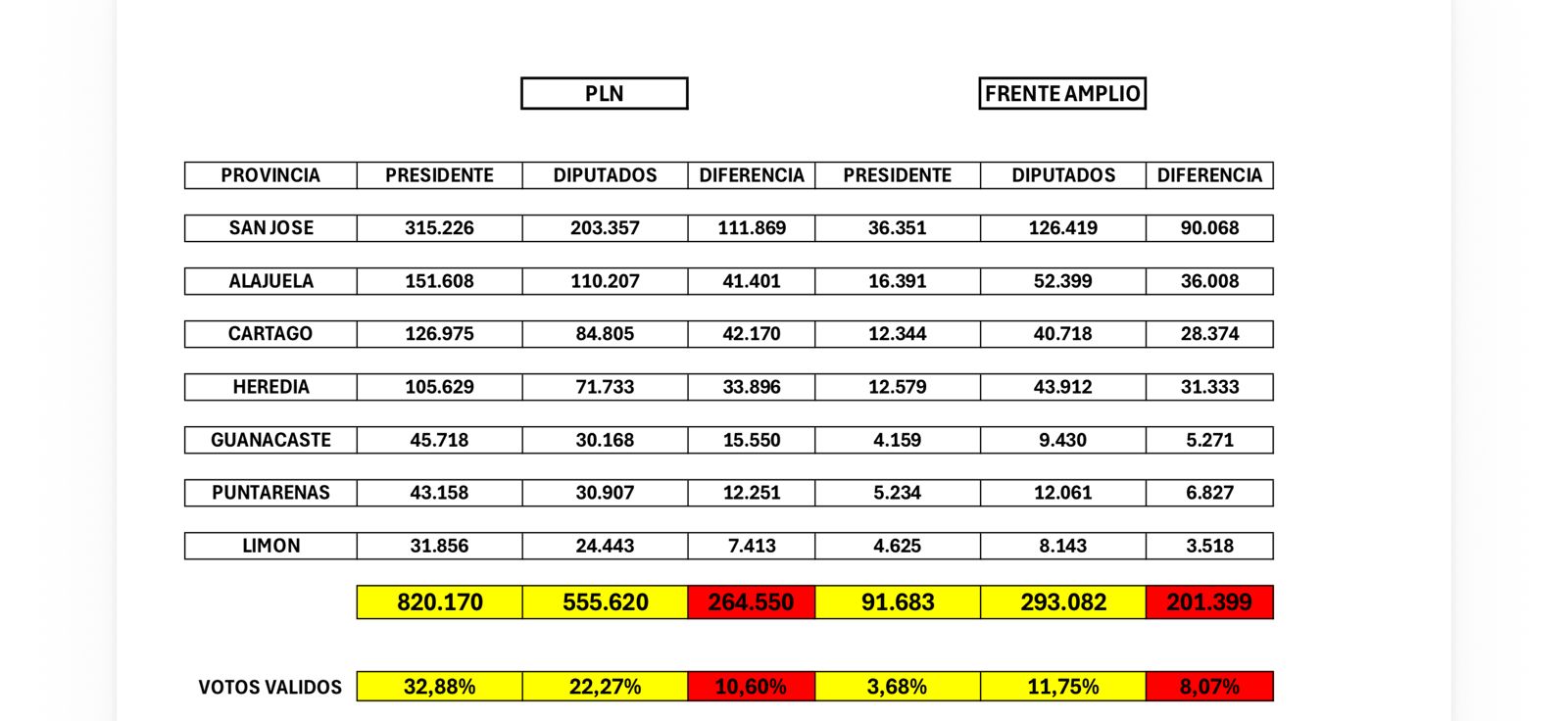 En el caso del PLN, por ejemplo, la diferencia entre los votos obtenidos por la candidatura presidencial y los logrados por sus diputaciones es amplia y constante en todas las provincias.